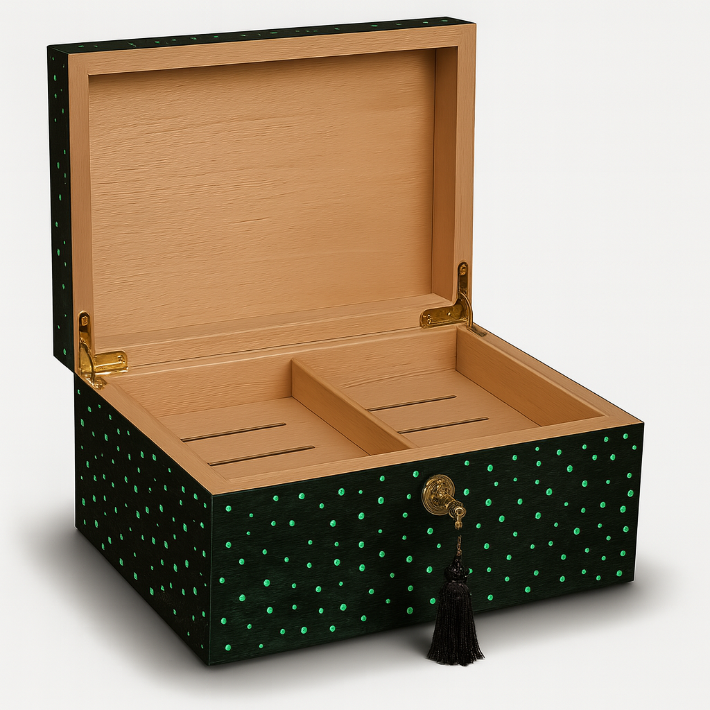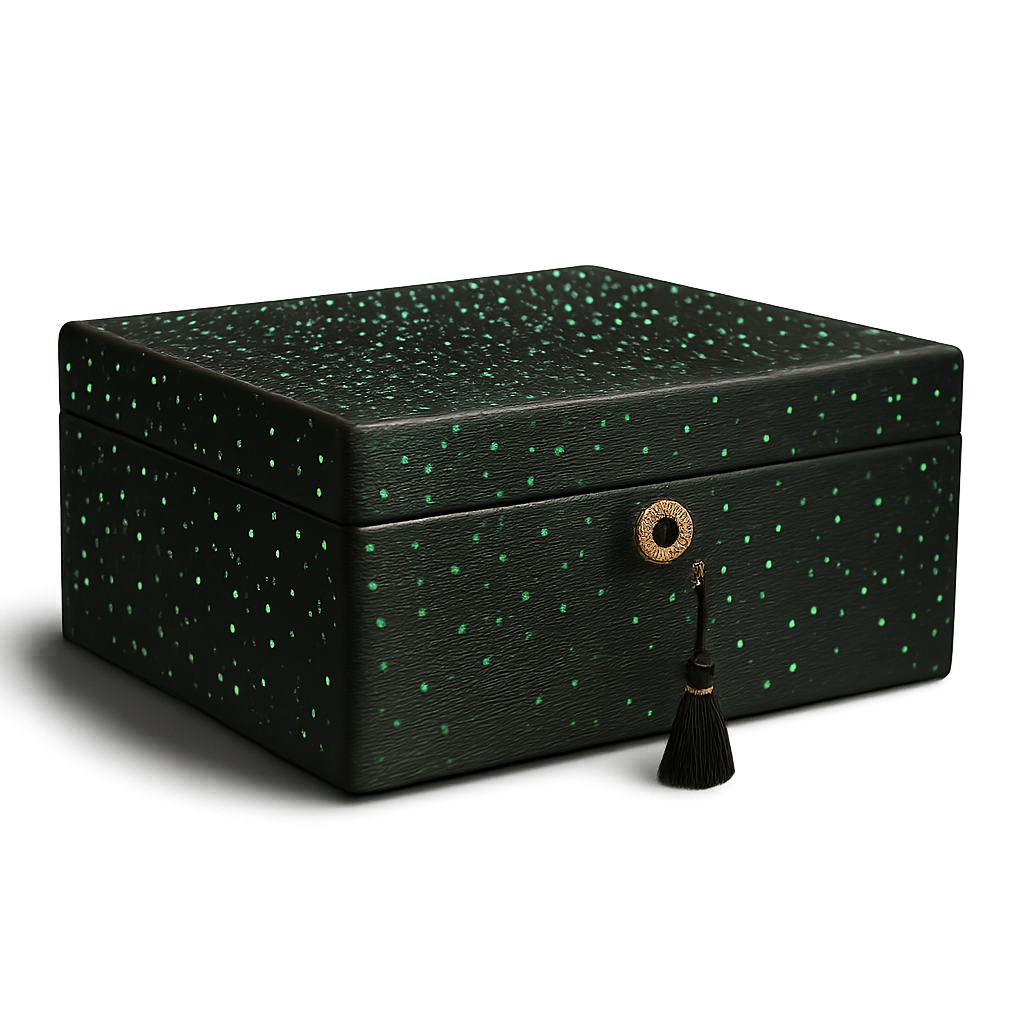 At first glance, it is a sleek lacquered humidor. But when night falls, hand-applied luminescent stones awaken, glowing like a constellation across its surface.