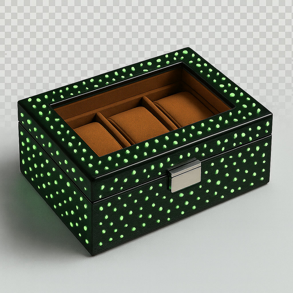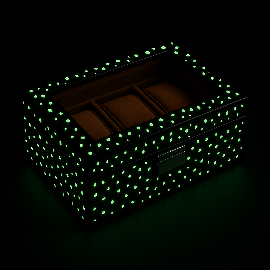 At first glance, it is a sleek dark varnished case. But when night falls, hand-applied luminescent stones awaken, glowing like a constellation across its surface.