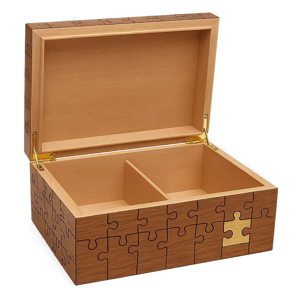 Crafted from rich, hand-finished wood, The Missing Piece is designed with an intricate puzzle pattern that wraps across its surface. At the heart of its design lies a single brass puzzle piece a subtle yet striking detail that transforms the box from a humidor into a statement of meaning.