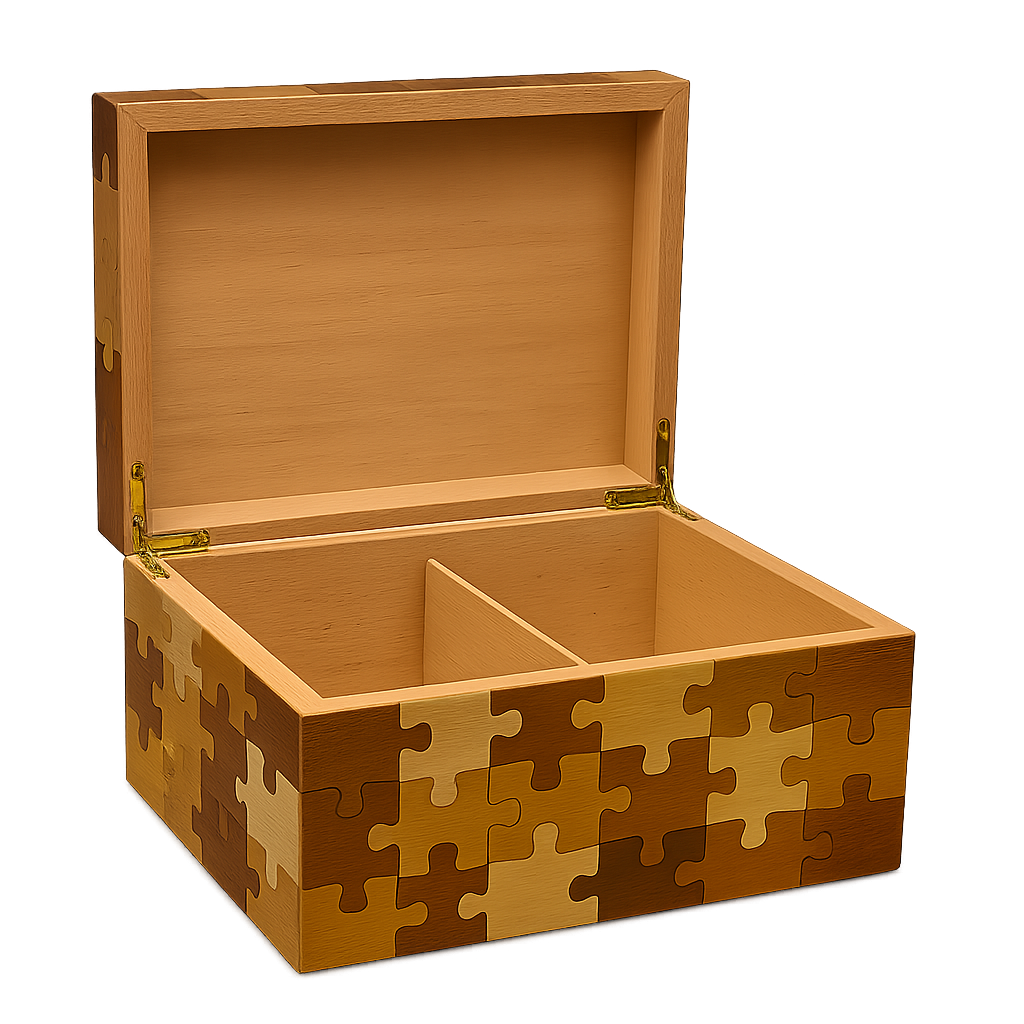 Each humidor is constructed from interlocking puzzle pieces, alternating in three distinct wood tones, pale natural, warm mid, and deep dark.