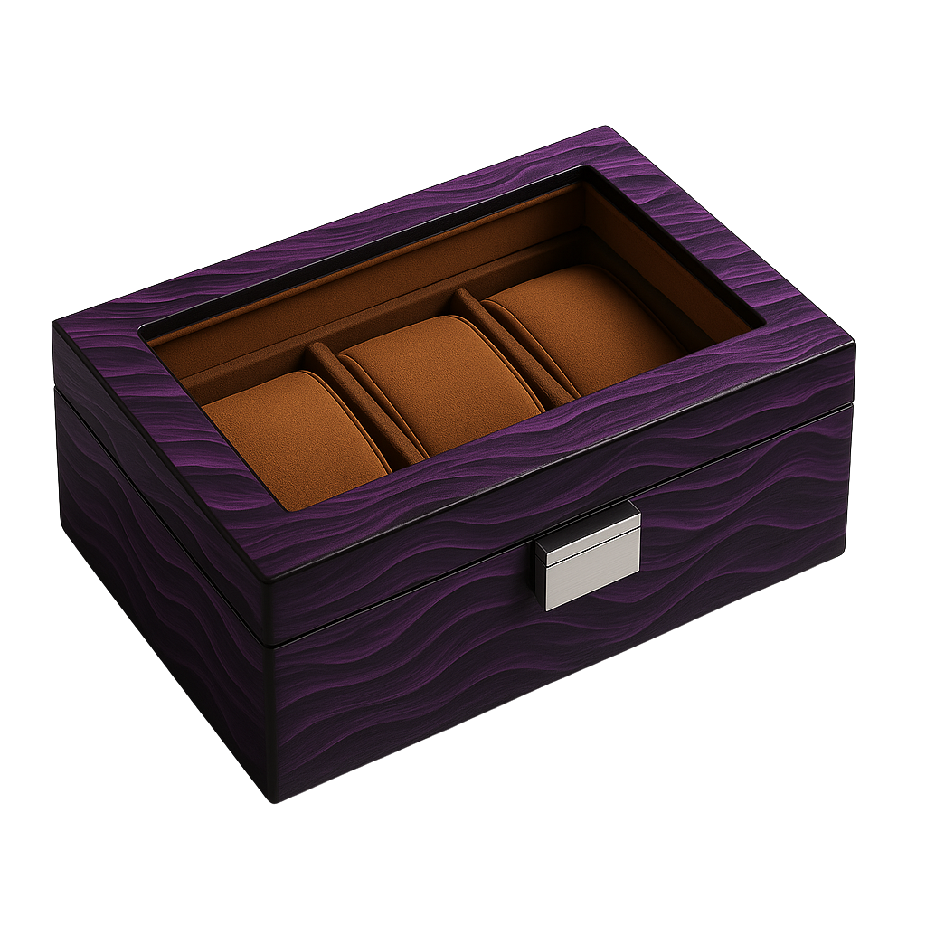 Inside, a soft interior protects each watch with quiet sophistication, contrasting against the sculpted exterior.