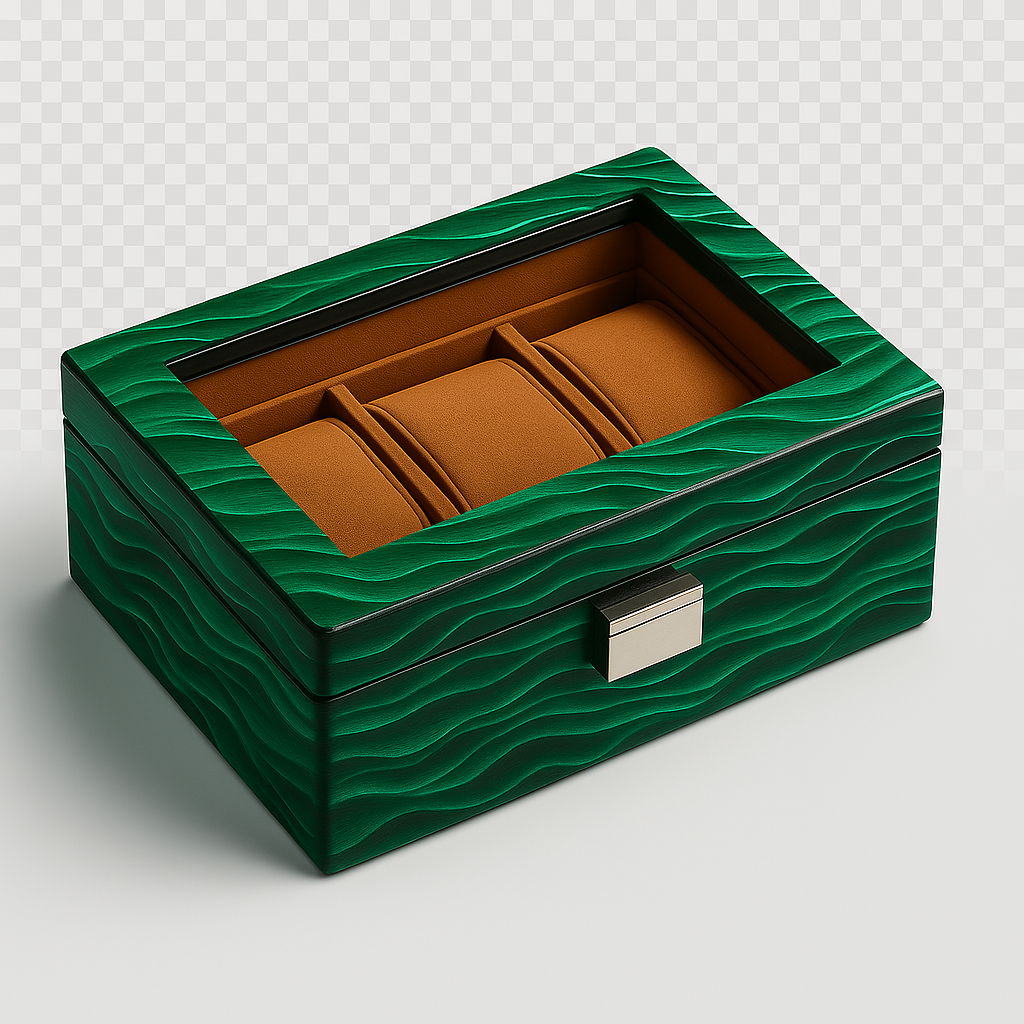 Inside, a soft interior protects each watch with quiet sophistication, contrasting against the sculpted exterior.
