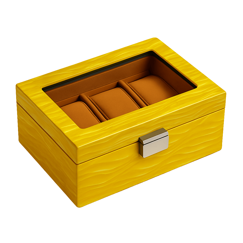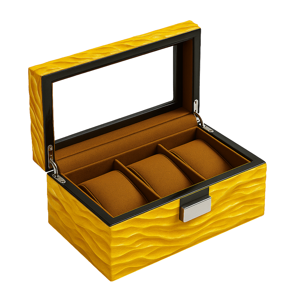 Inside, a soft interior protects each watch with quiet sophistication, contrasting against the sculpted exterior.