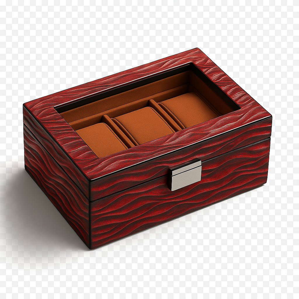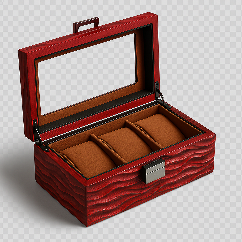 Inside, a soft interior protects each watch with quiet sophistication, contrasting against the sculpted exterior.