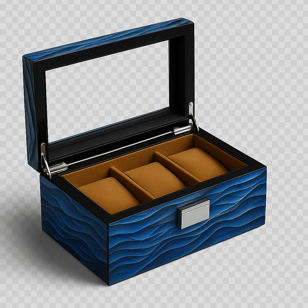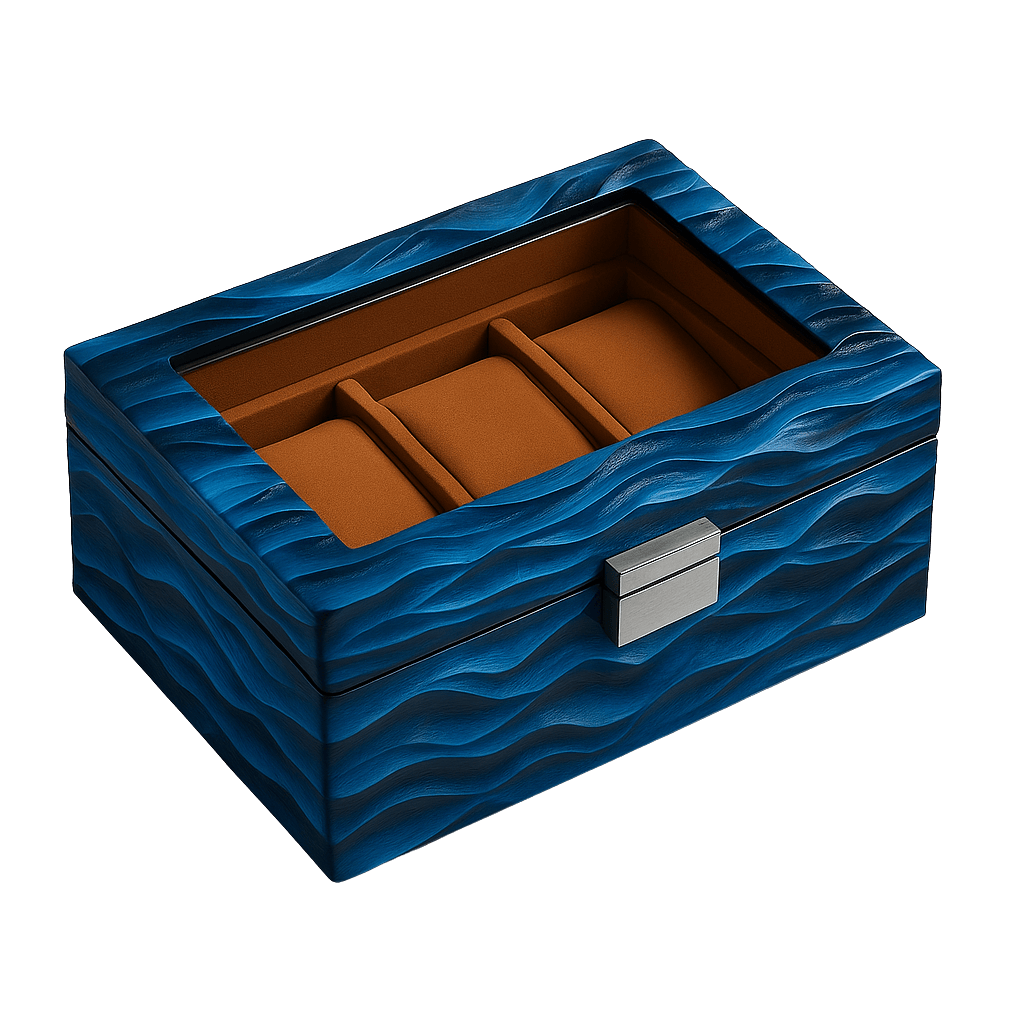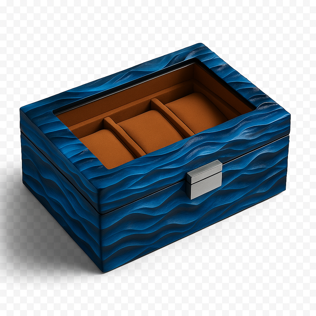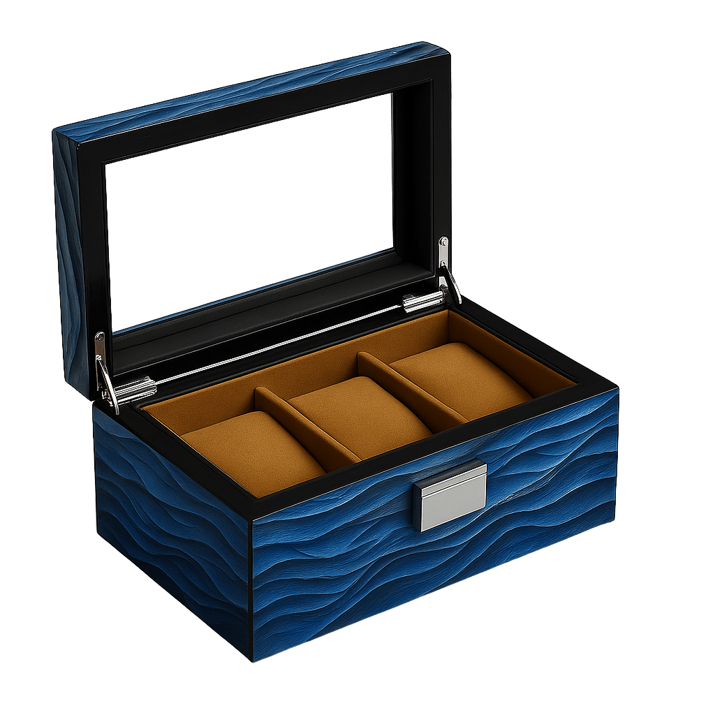 Inside, a soft interior protects each watch with quiet sophistication, contrasting against the sculpted exterior.